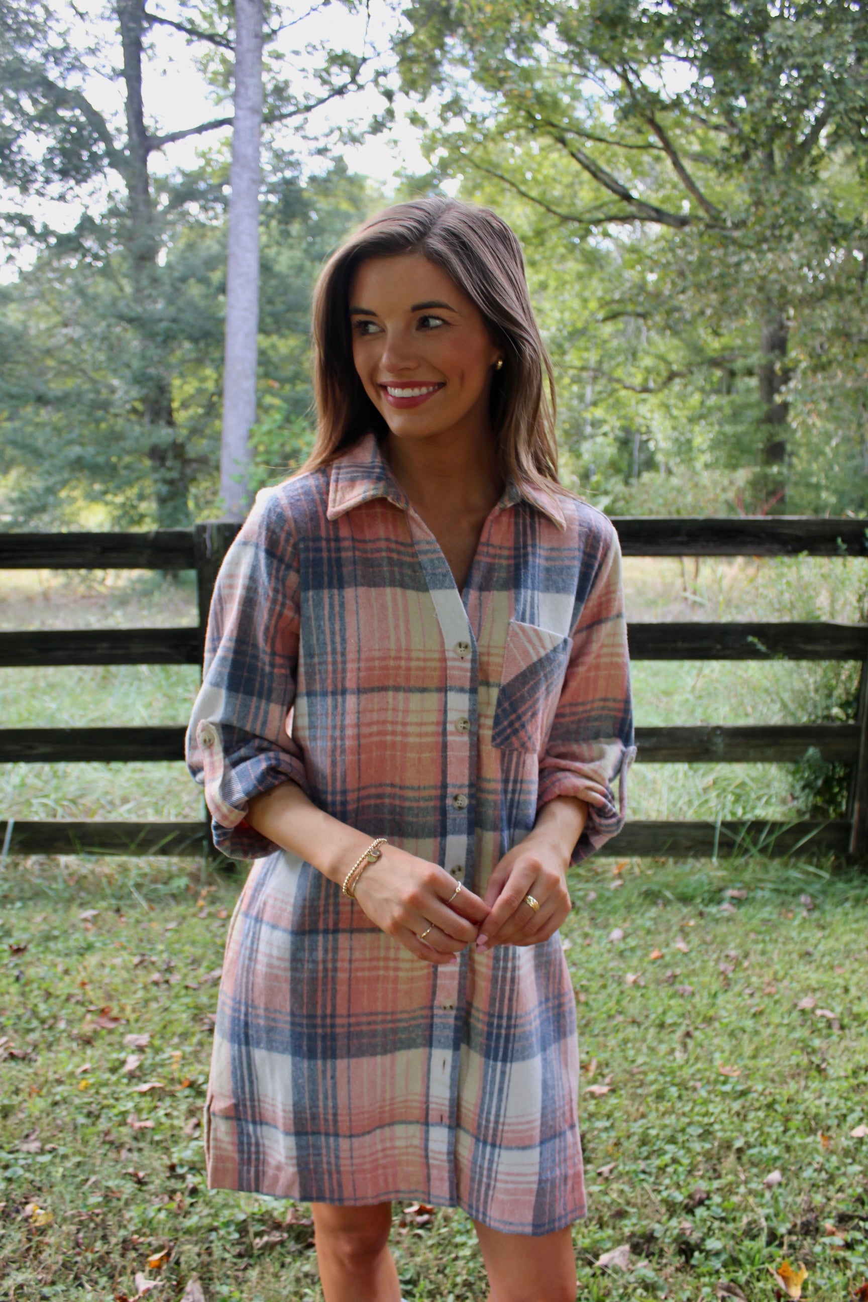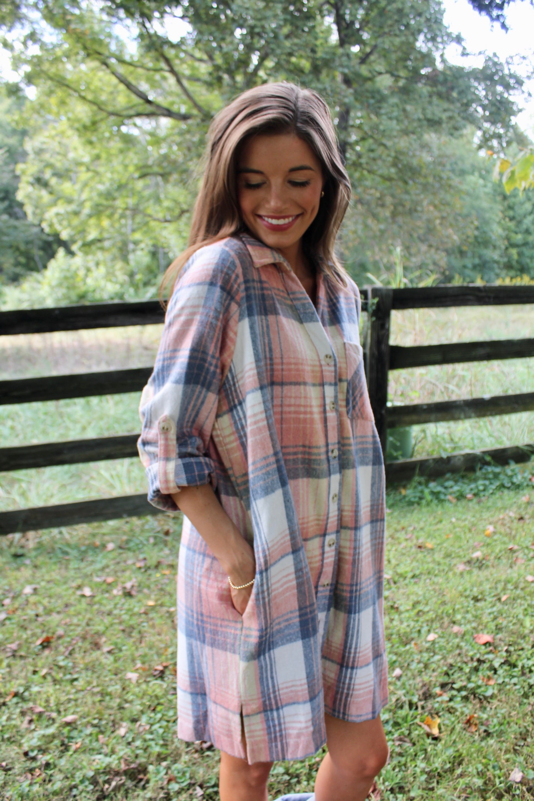 Plaid button up flannel dress with pockets.